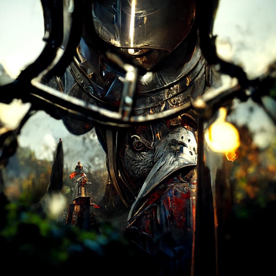This image shows a medieval knight in full armour standing next to a well. The scene is rendered with dynamic and volumetric lighting and intricate detail, in a dark fantasy aesthetic.