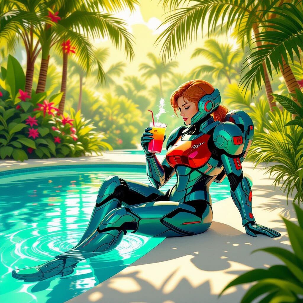 This image shows Samus Aran in her power suit enjoying a tropical paradise. The scene is bathed in warm light and rendered in a vibrant art nouveau aesthetic with bioluminescent flora.