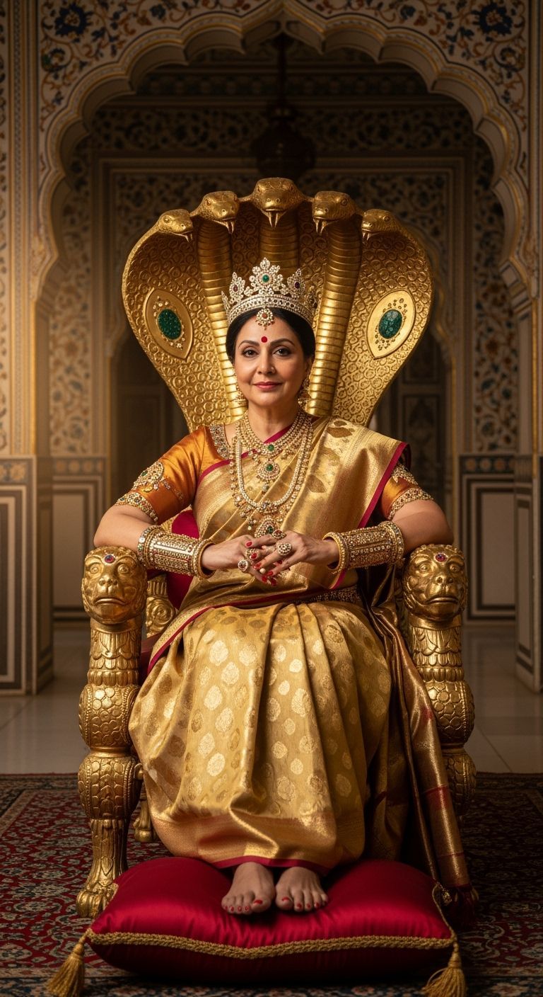 This image shows a serene, middle-aged Indian Maharani regally seated on an ornate gold throne. She wears a luxurious gold saree and elaborate jewelry, set in an opulent Indian throne room. The image is a professional photograph with vibrant colors.