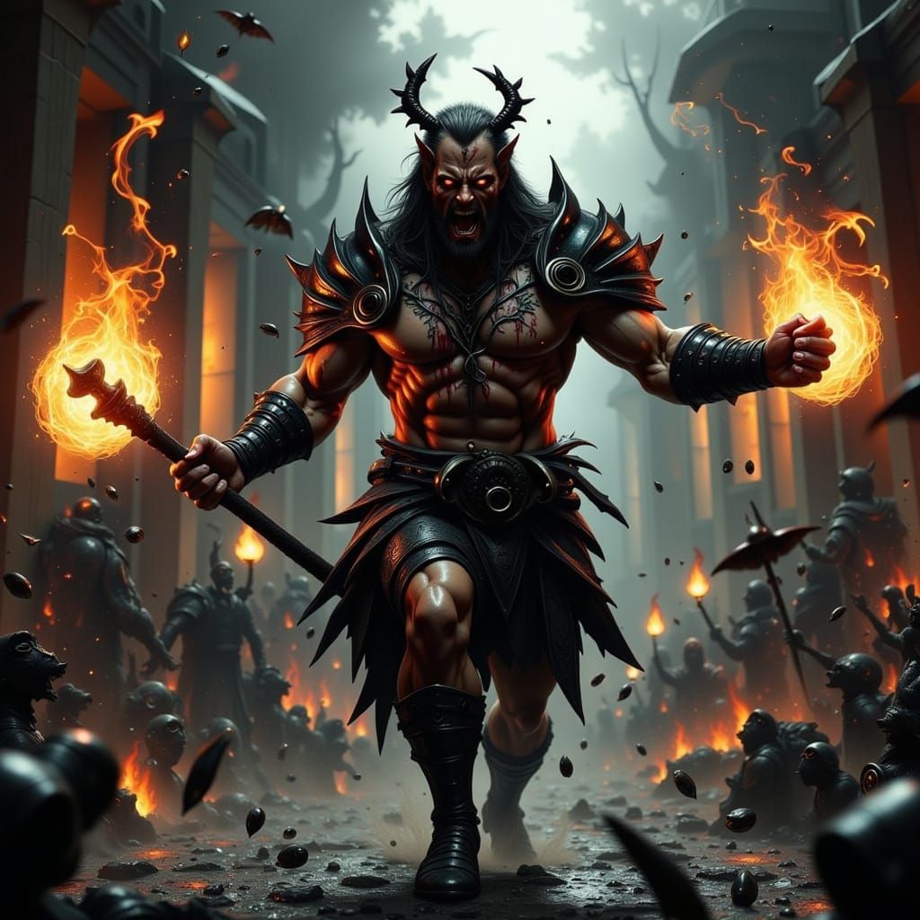 This image depicts a muscular warrior in a dimly lit, smoke-filled arena, unleashing a brutal kick amidst a flurry of punches and cheering crowds. The scene is set against a backdrop of ancient stone, with bold textures and high-contrast colors accentuating the blood-soaked mouthguard and tattered armor.