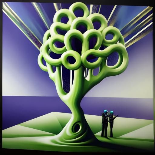 A surreal and highly detailed image featuring twisted, curling shapes and symbols in vivid colors. The piece evokes a psychedelic and expressionistic style, rendered with glossy and matte textures.