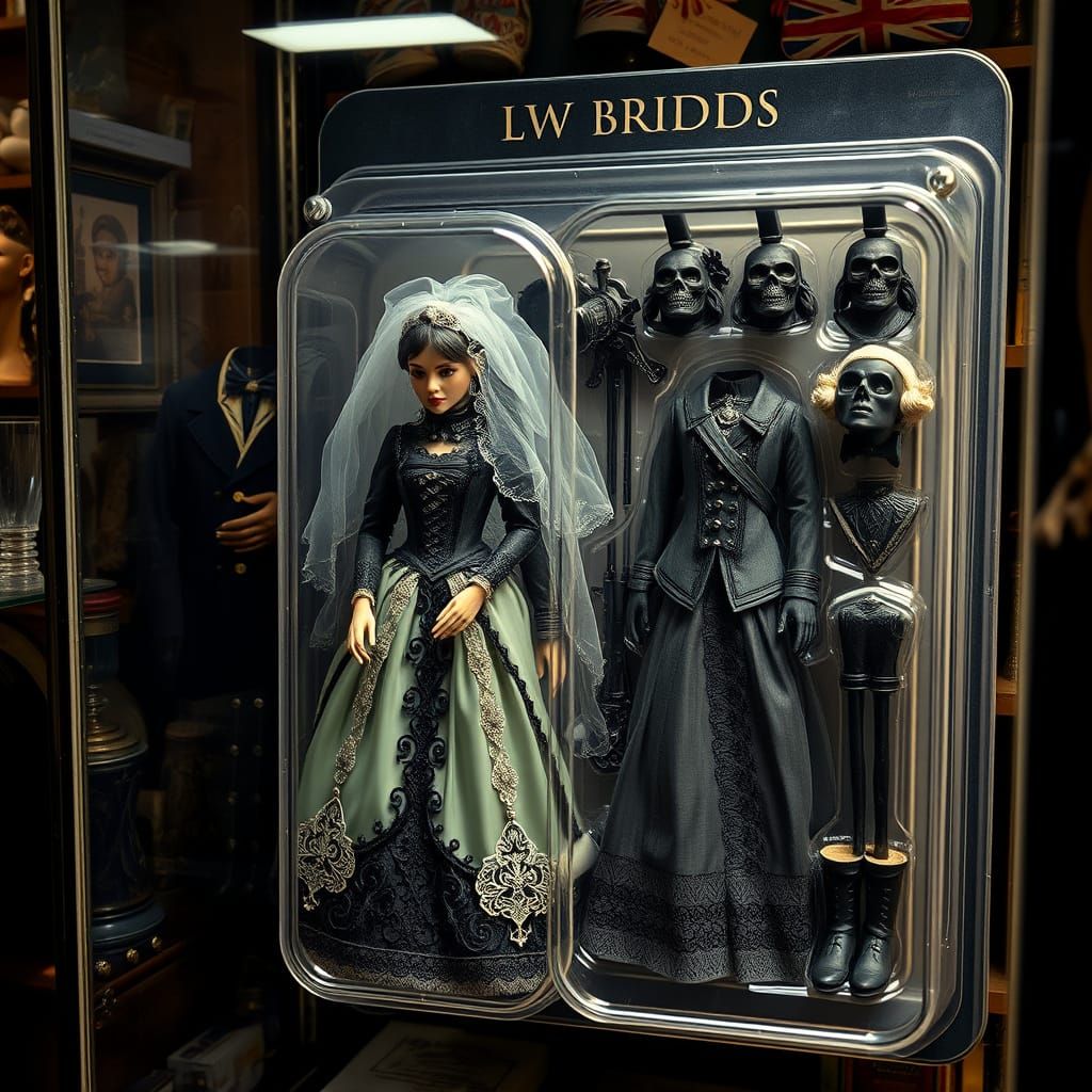 This image shows a meticulously detailed digital painting of a Victorian-era bride toy displayed in a toy shop, surrounded by a maximalist atmosphere and cinematic lighting.