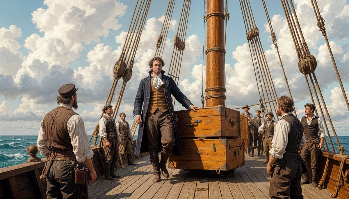 This image shows a man dressed in formal attire boarding a wooden sailing ship in the 1880s. Crew members watch as his luggage is loaded onto the ship. The image is reminiscent of an oil painting.