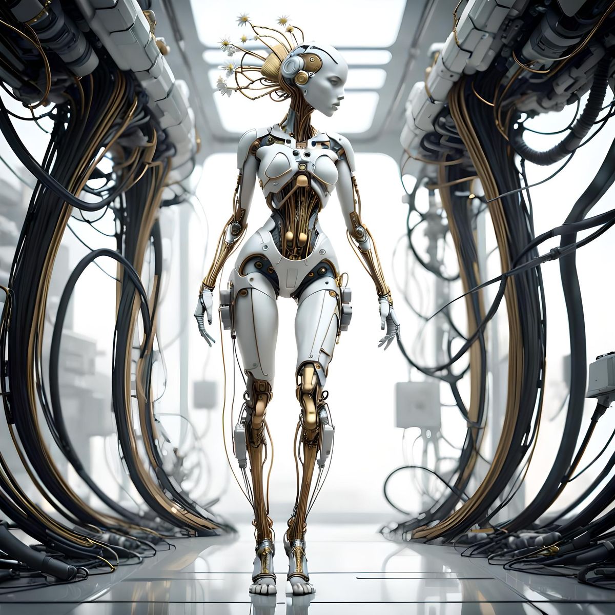 Human made of wires, dynamic pose, futuristic biopunk background. digital matte painting V-Ray doubletime displacement mapping trending on artstation Greg Rutkowski cinematic dramatic impactful in white ivory and gold, flowercore, futuristic elegant biopunk, long legs, highly detailed