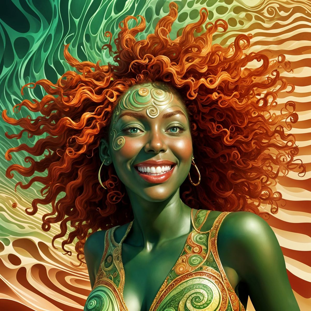 A vibrant image of a mixed-race African woman laughing on a beach. The top-down shot showcases her flowing red curly hair, striking green eyes, and the warm sunlight, rendered as digital art with fractal patterns.