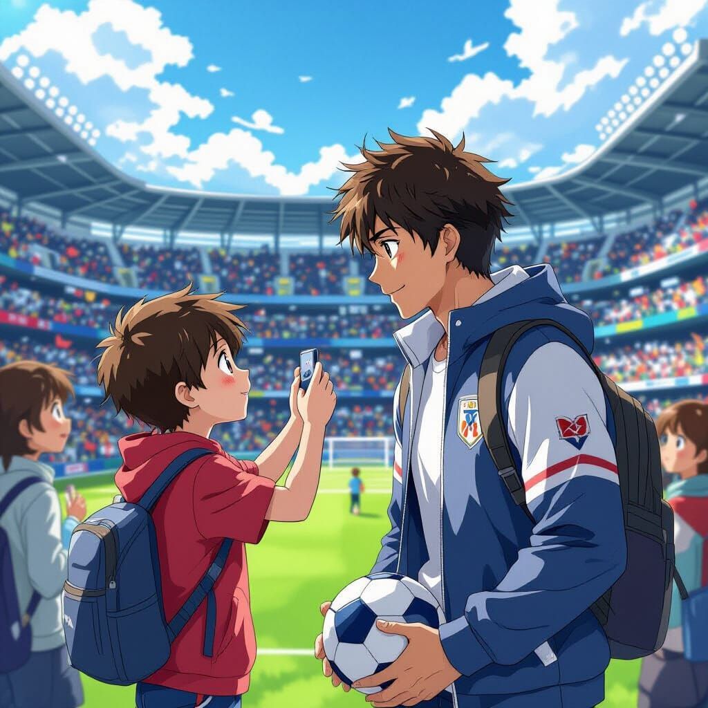 Generate your own anime-style images of kids with famous soccer players in fan zones. Free and easy AI creation.