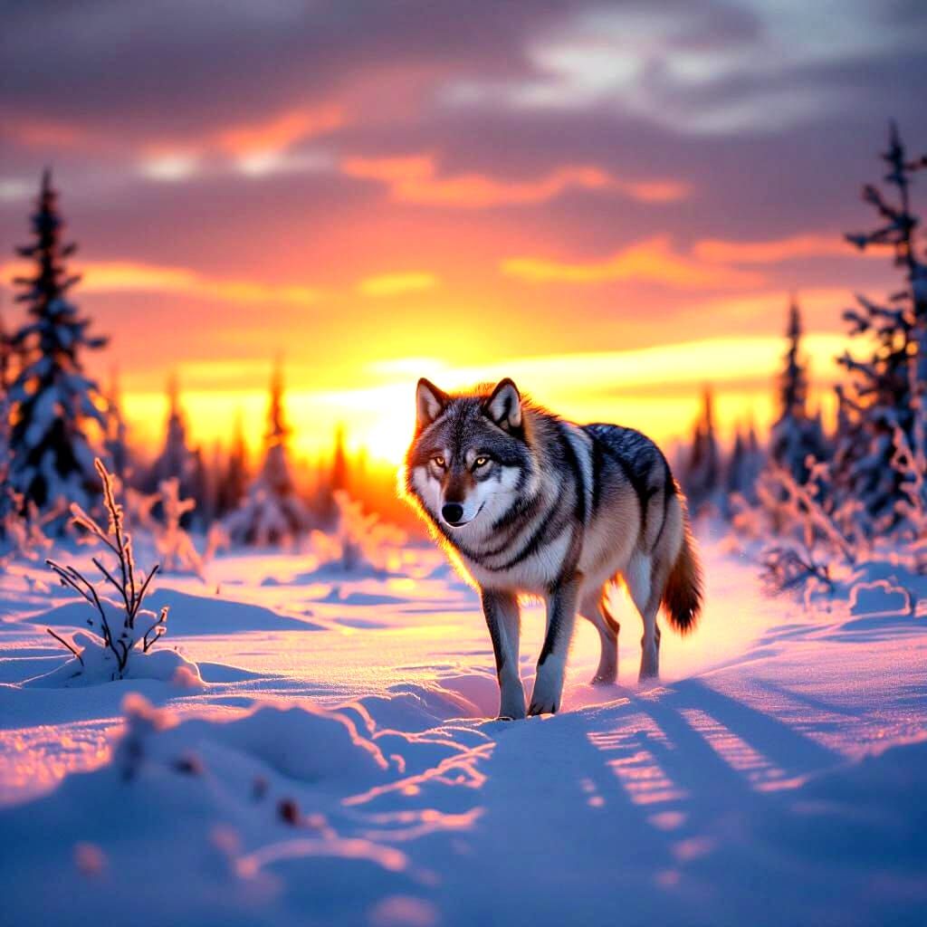 This photorealistic image captures a powerful wolf stalking through a snowy landscape as the sun sets, bathed in golden light and dramatic shadows. High detail and cinematic lighting create a stunning scene.
