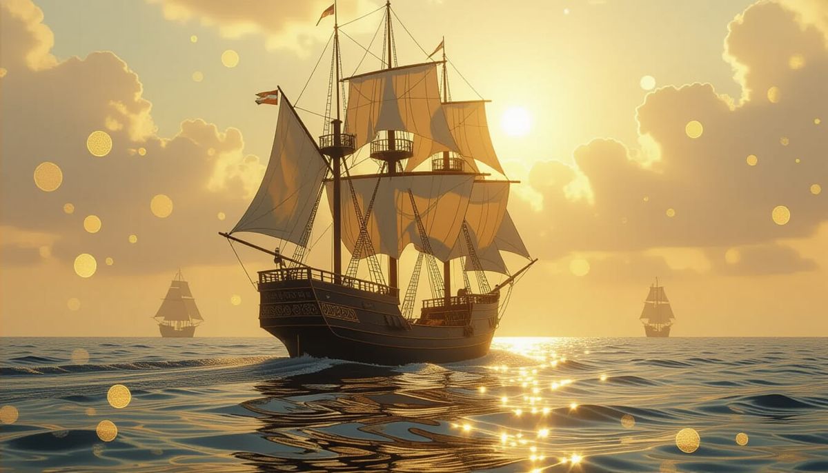 This image shows a majestic ship with many sails, bathed in the warm glow of a golden hour sunrise. The sea sparkles with soft light, creating a dreamy atmosphere of adventure and wonder.