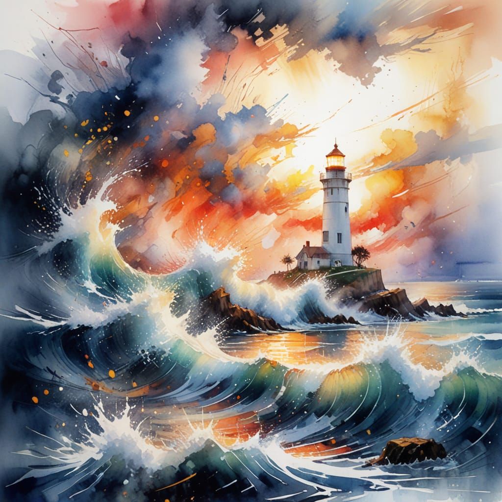 This image captures a lone lighthouse during a vibrant sunset storm, rendered in a unique impressionistic Cubism style with delicate watercolor and ink.
