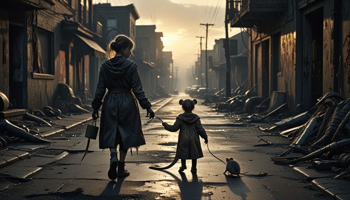This image shows a young girl in ragged clothes holding a toddler's hand while walking down a desolate street. The picture is reminiscent of dystopian art with distorted forms, muted colors, and high contrast.