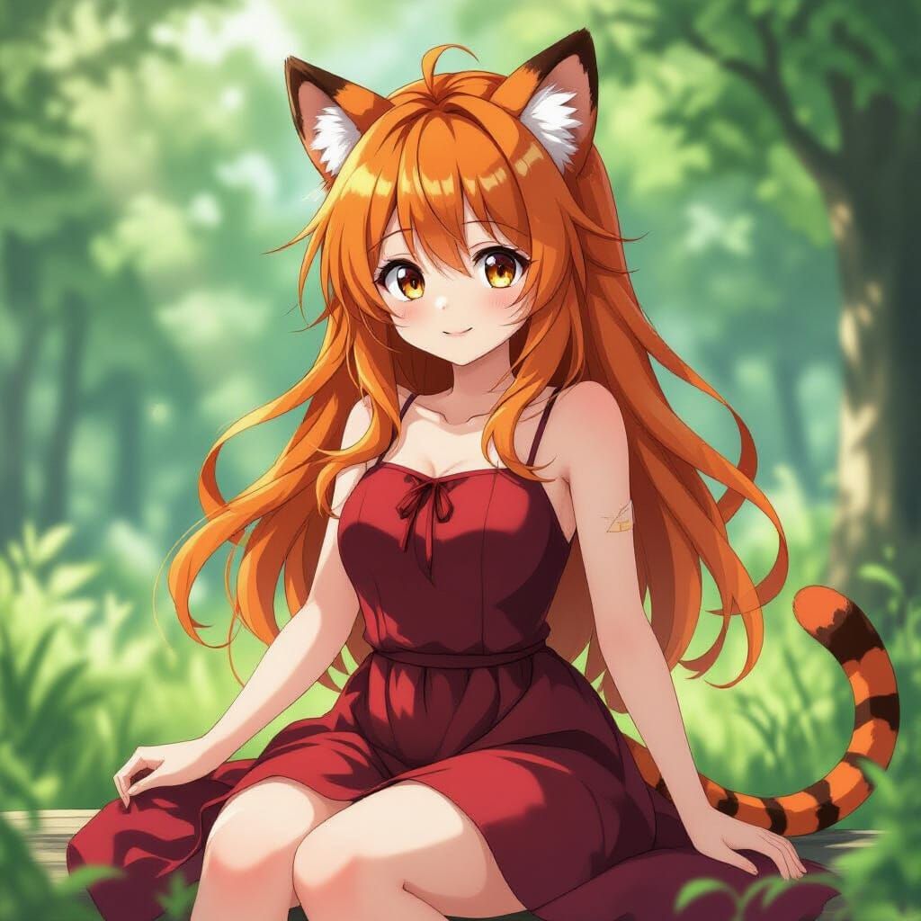 This image features an anime girl with distinctive tiger ears and tail, vibrant orange hair and eyes, and a sophisticated wine-colored dress. Rendered in a dreamy, Ghibli-inspired anime style with cinematic lighting.