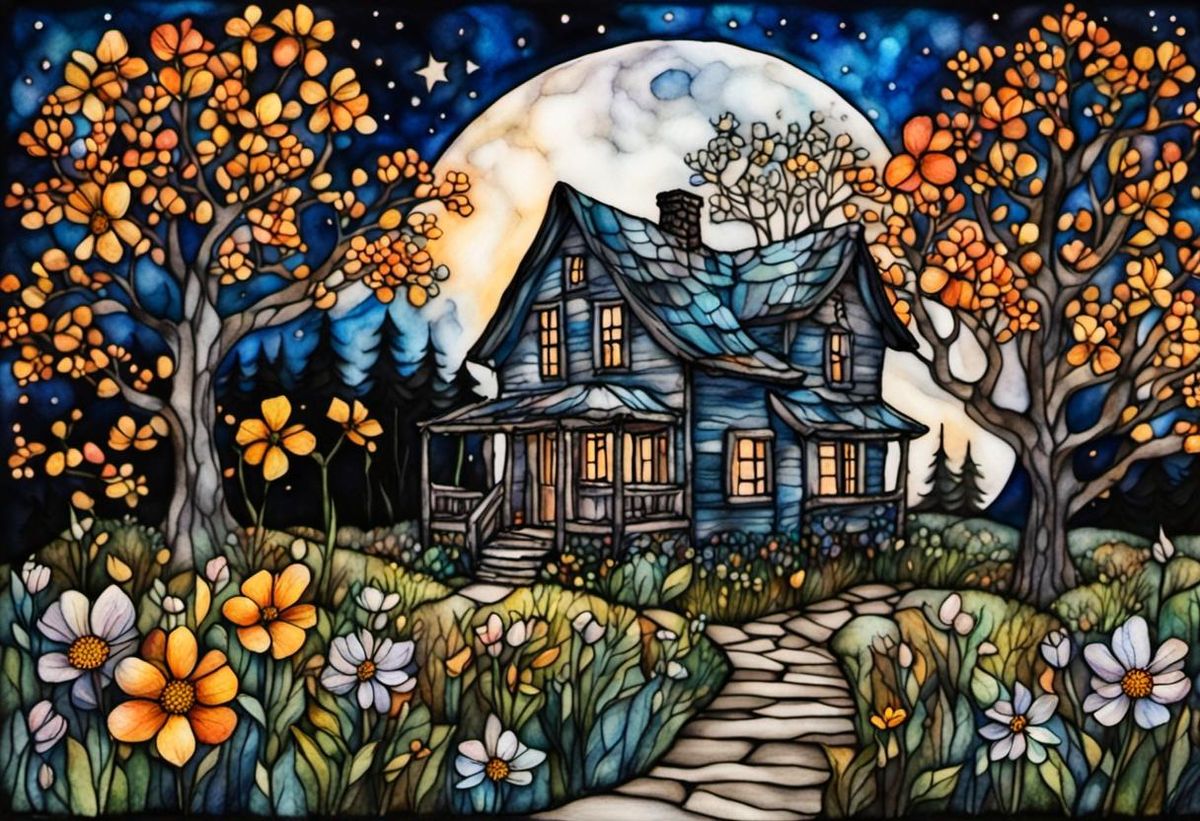 This image depicts a house at night under moonlight, rendered with a 3D effect. Black ink outlines define the image, which includes botanically accurate spring flowers.