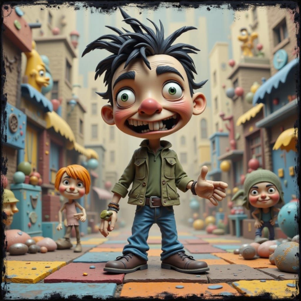 This image showcases a character rendered in a Claymation style with elements of a Funko Pop figure. The composition features tiling patterns and stylized anatomy.