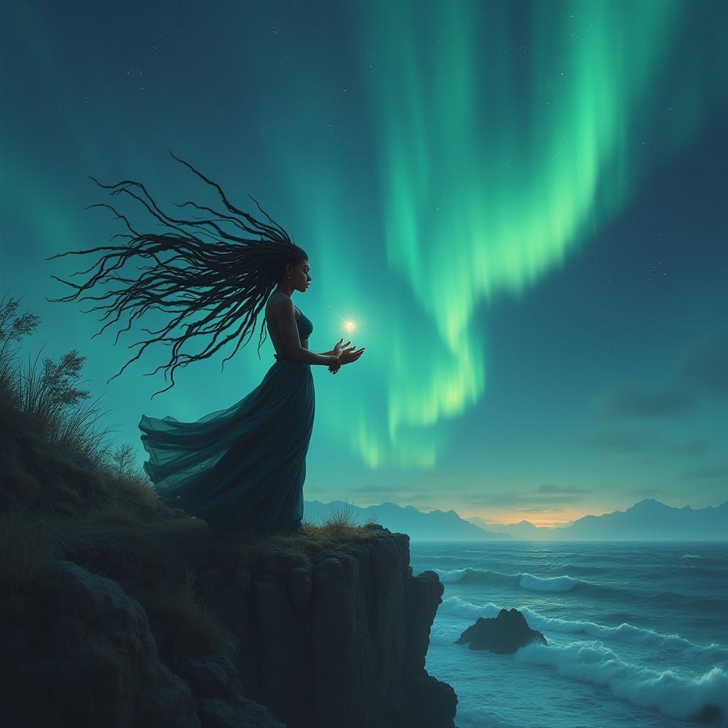 This image shows a black woman with dreadlocks on a cliff under the Northern Lights. The portrait, rich with detail, evokes the style of photographic realism.