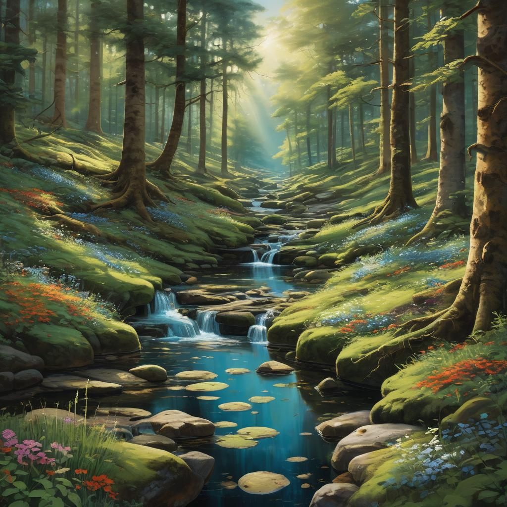 This image shows an enchanted forest bathed in sunlight, with a stream winding through mossy stones. The scene exudes peace and harmony, captured with intricate details and cinematic lighting. The image has a hyperrealistic, moody aesthetic.