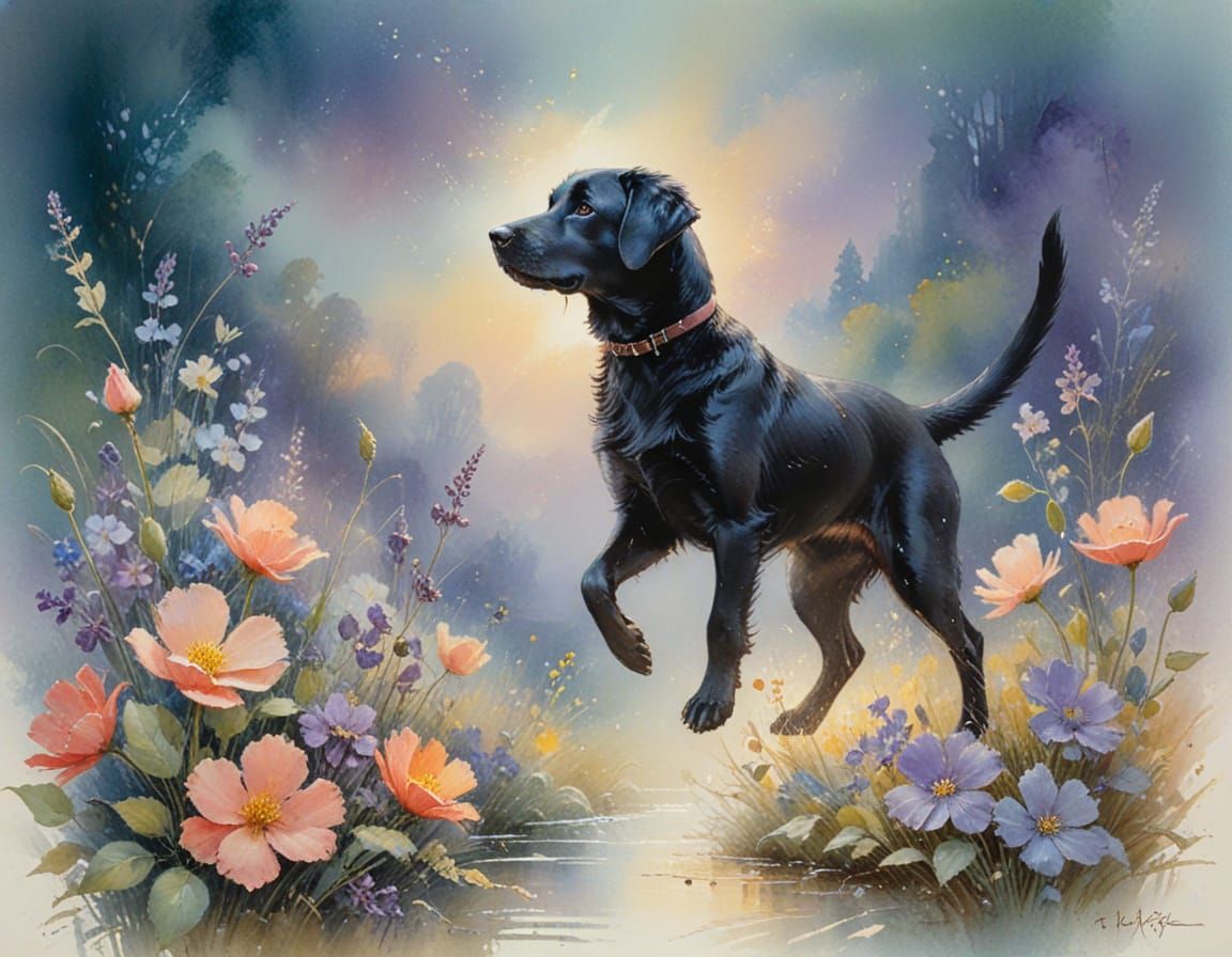A watercolour painting of an adorable black lab puppy. The image employs a pastel color palette and open composition, reminiscent of storybook illustrations.