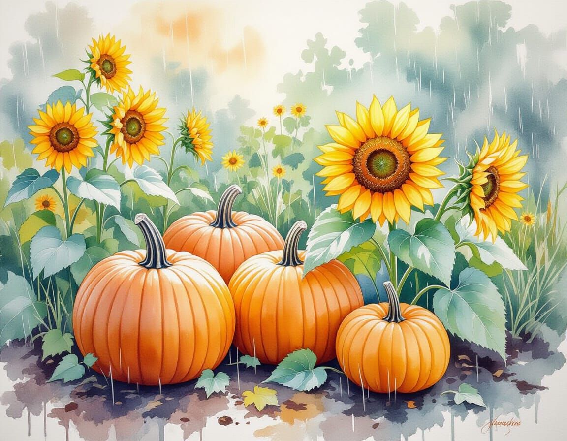 A charming image of pumpkins and sunflowers in a garden, depicted with a rainy, foggy atmosphere. The artwork is rendered in a picturesque and colorful style with watercolor and ink techniques.