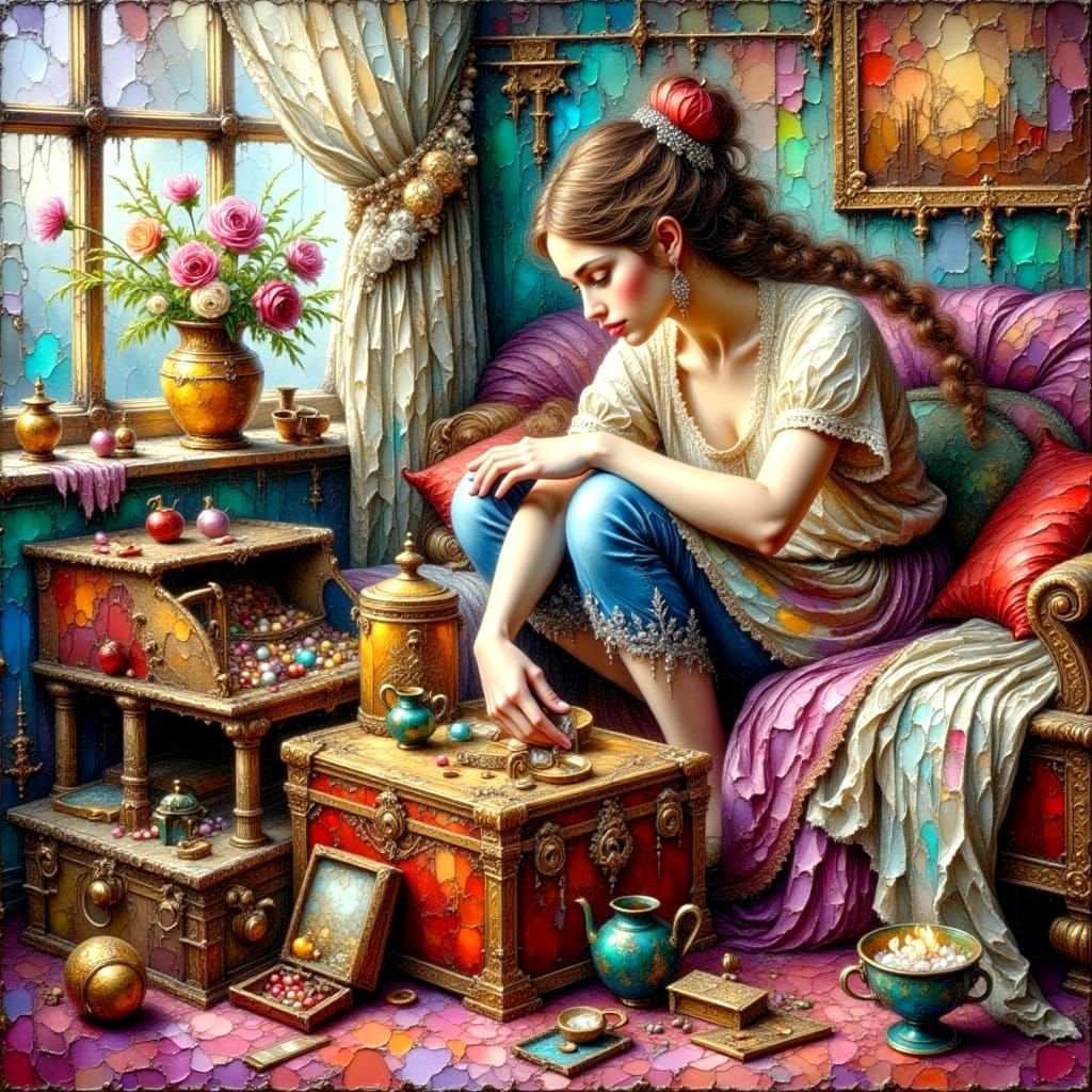 This image shows a modern woman discovering a treasure chest in an attic. The art style evokes impasto oil painting techniques with textured, volumetric brush strokes and a soft color palette.
