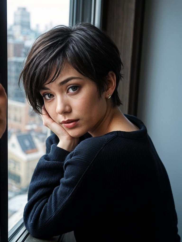 This image shows a young woman with short dark hair leaning against a window. The woman is dressed casually in a black sweater, with a cityscape visible in the background.