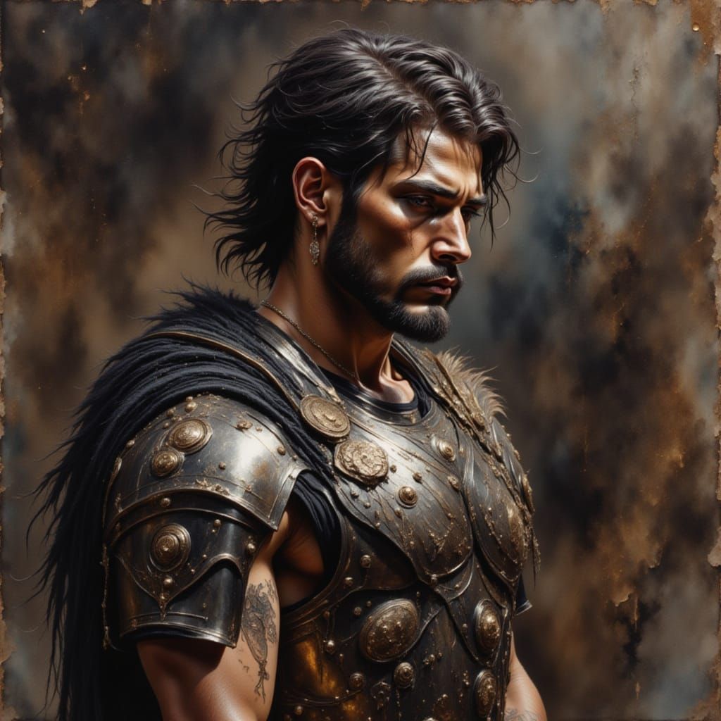 A watercolor portrait of a muscular warrior preparing for battle. Soft lighting illuminates his bronze armor and solemn expression in a dimly lit, ancient Greek room, rendered in warm earth tones.