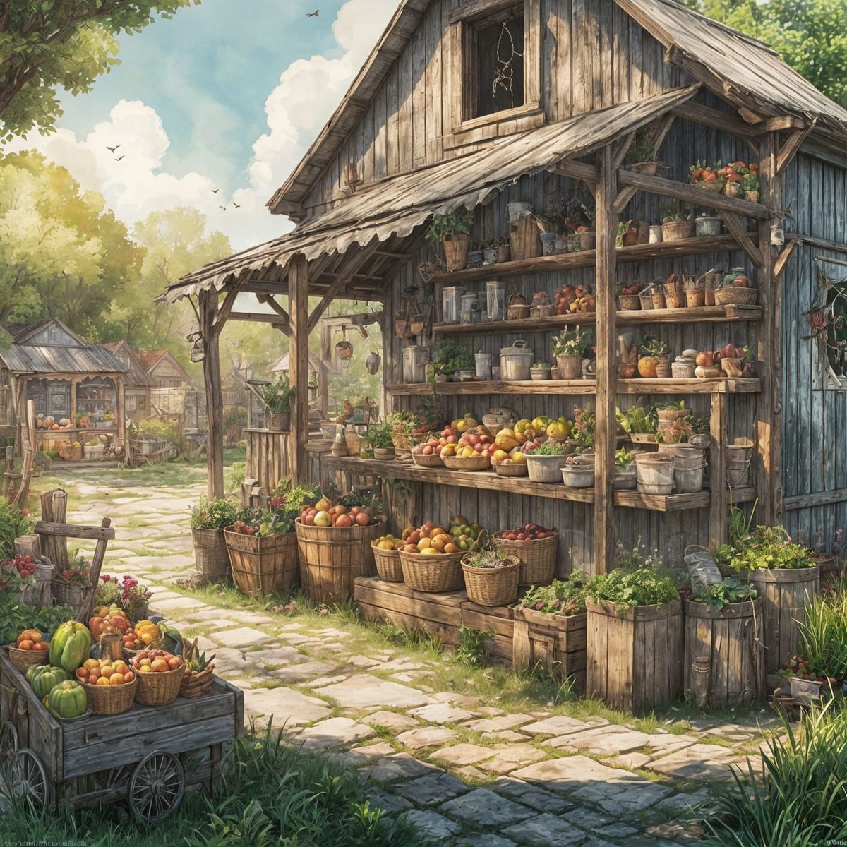 This image shows a cozy farmstand illustration with a welcoming atmosphere. The artwork features playful ink sketches, watercolor tones, and intricate details in a storybook style, as a detailed matte painting.