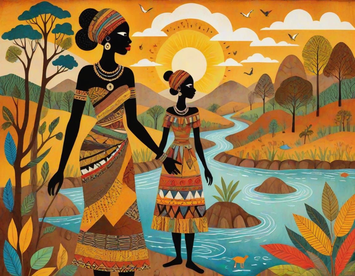 This image is a vibrant collage of a spiritual encounter in a dreamlike atmosphere, featuring earthy tones, textured patterns, and symbolic motifs reminiscent of African folk art and naive style