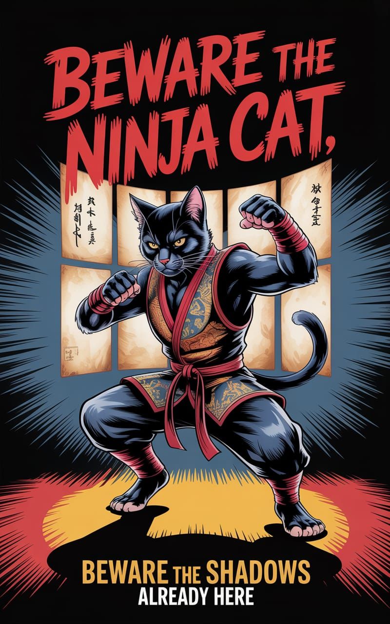 This image shows a black ninja cat in a dramatic battle stance. The comic book style poster features bold lettering and a backdrop of aged rice paper panels, creating a dynamic and intense scene with dramatic spotlighting.