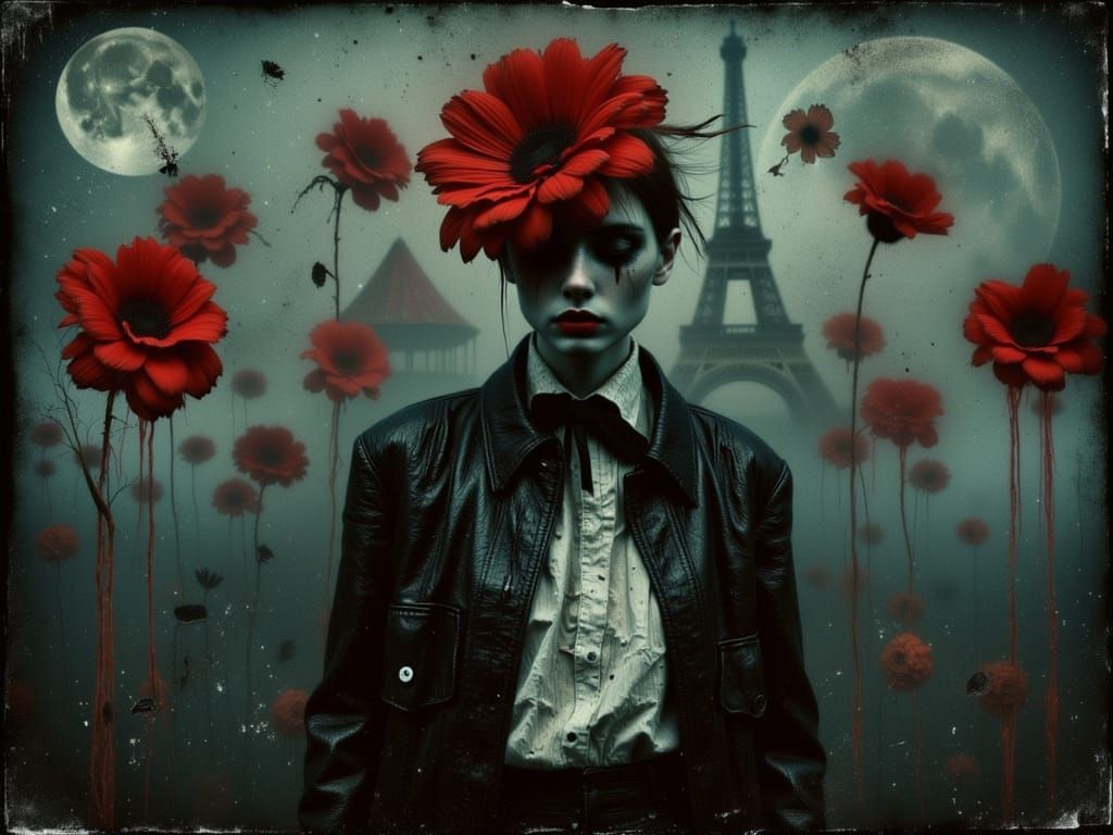 This image features a delicate, melancholy young Gothic woman with red hair, embodying a surreal, moonlit circus noir aesthetic with abstract, blurred movement and oversized blooms.