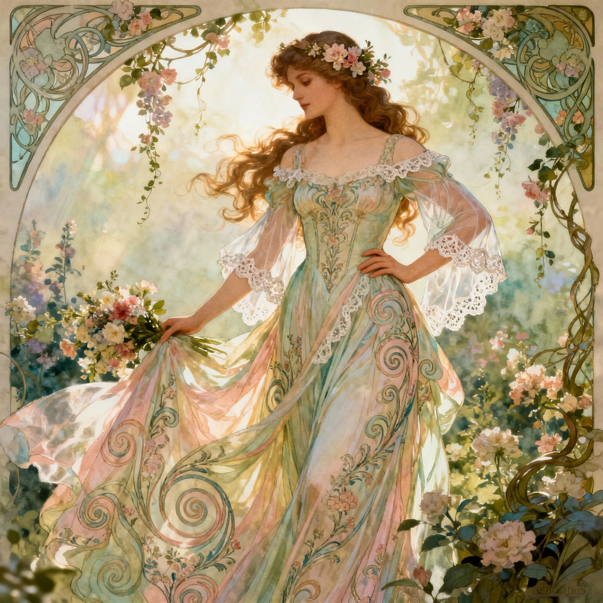 This image depicts a beautiful woman from the Art Nouveau period, dressed in a flowing, lovely gown. The style is elegant and artistic.