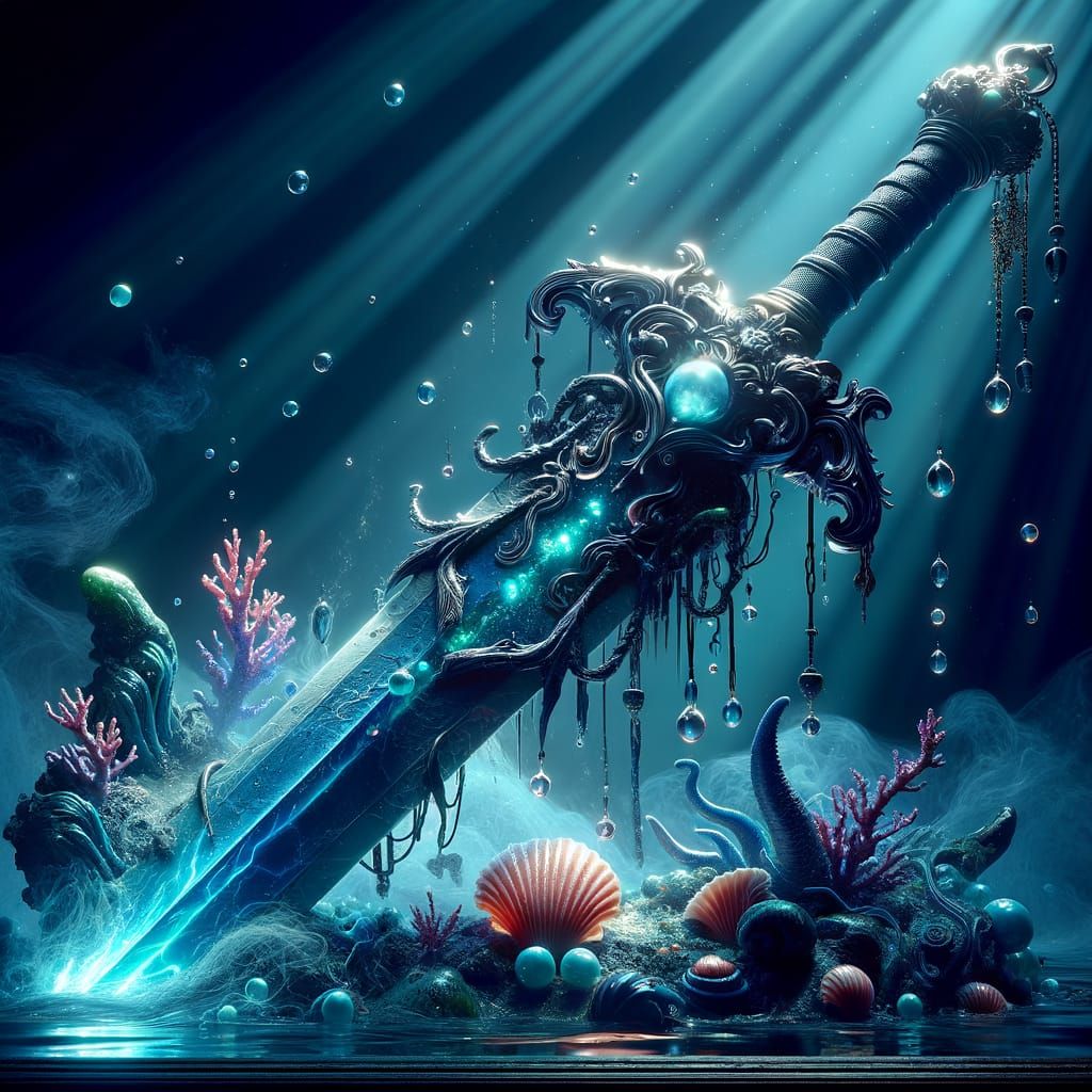 "Une épée mystique surgissant des profondeurs abyssales, sa lame semblant être sculptée dans une matière liquide et ténébreuse, reflétant des lueurs bioluminescentes bleues et violettes. Le manche est orné de coraux anciens et de coquillages mystérieux, incrustés de perles luminescentes. Autour de l'épée, ...
