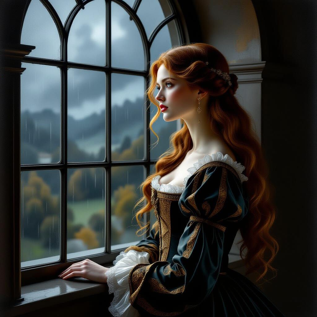 This image depicts a woman in a Renaissance gown looking out a window at a rainy scene, rendered with dramatic lighting and anatomical detail reminiscent of High Renaissance art.