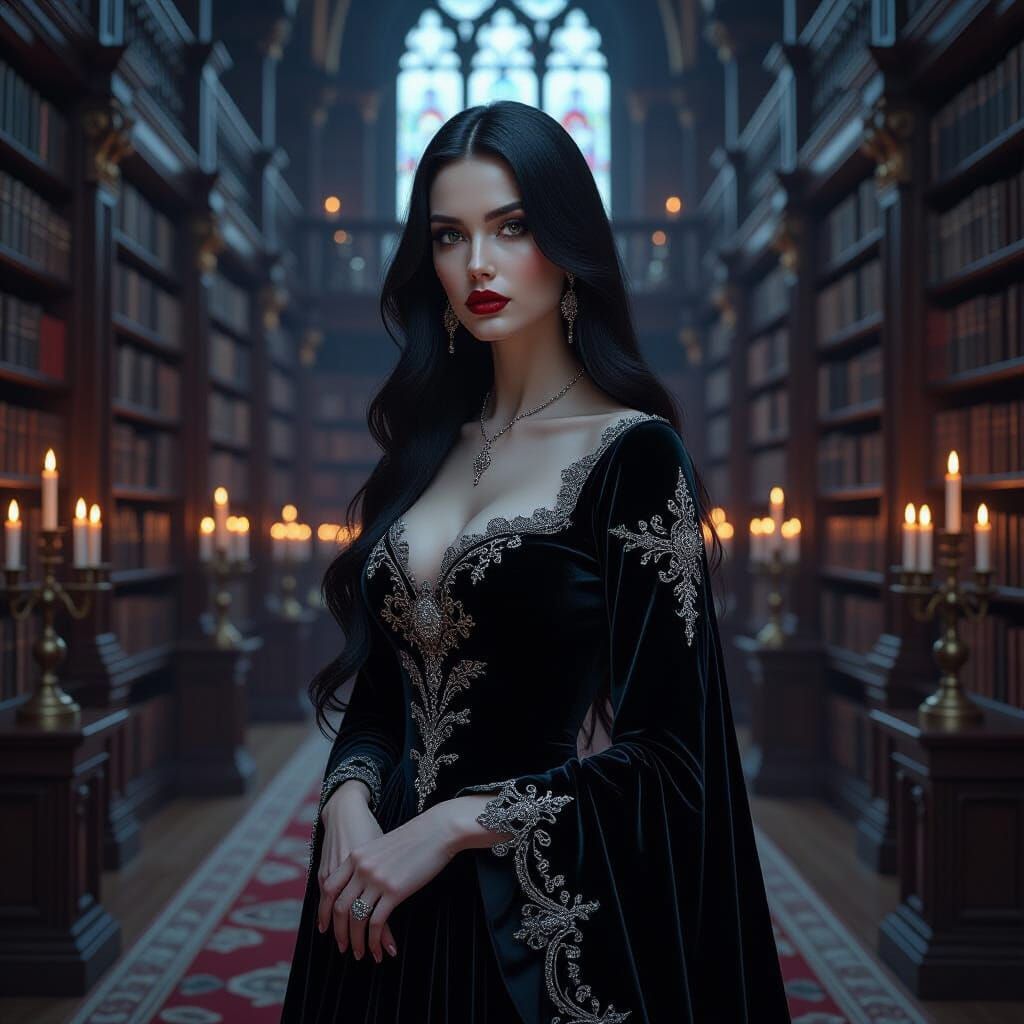 A gothic woman stands in a vast library among old books and candles. The image is reminiscent of gothic horror, using dramatic lighting to create a haunting, hyperrealistic atmosphere.