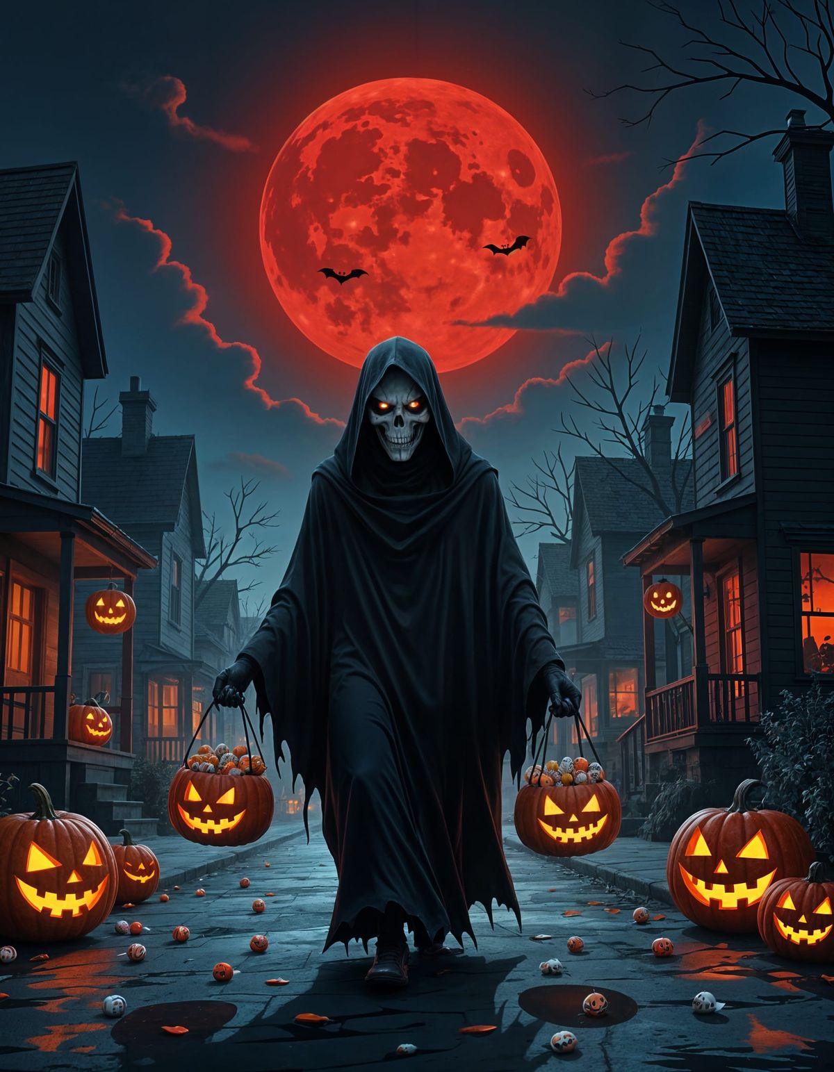 A haunting yet oddly cheerful grim reaper wanders through a desolate town square under a glowing red moon. His skeletal hands clutch a candy bucket filled with colorful sweets, gathered from eerie doorsteps during a night of twisted trick-or-treat. Despite his skeletal form, his face stretches into an unnerving, happy grin that glows faintly in the moonlight. Around him, flickering jack-o-jill lanterns line the cracked cobblestone streets, their smiles carved wickedly wide. The houses are adorned with spooky Halloween decorations—cobwebs, skeletal wreaths, and shadowy silhouettes lurking behind curtained windows.