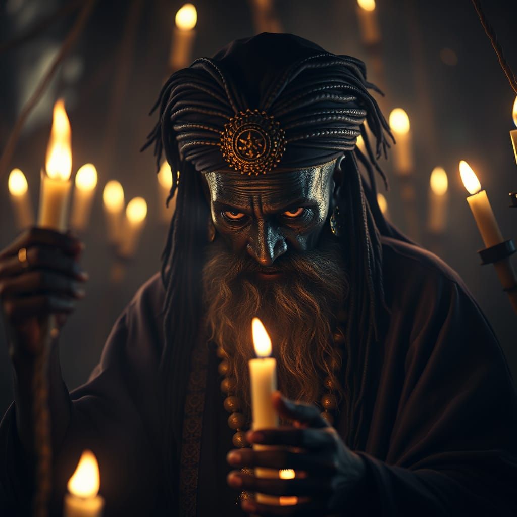 This image depicts a Papa Legba figure in a dark Voudou ritual setting. The scene features skulls, flickering candles, and dramatic lighting, creating a heavy, detailed and high-definition atmosphere.