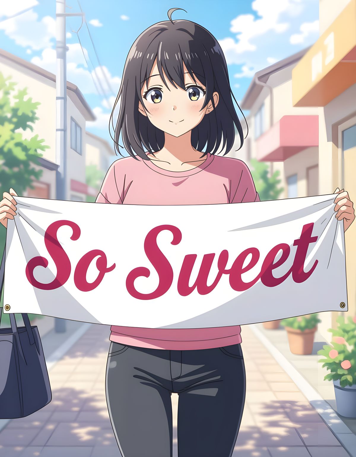 This image features an anime girl in a pink t-shirt and black pants holding a banner. The banner displays the text 'so sweet' in a vibrant and eye-catching design.