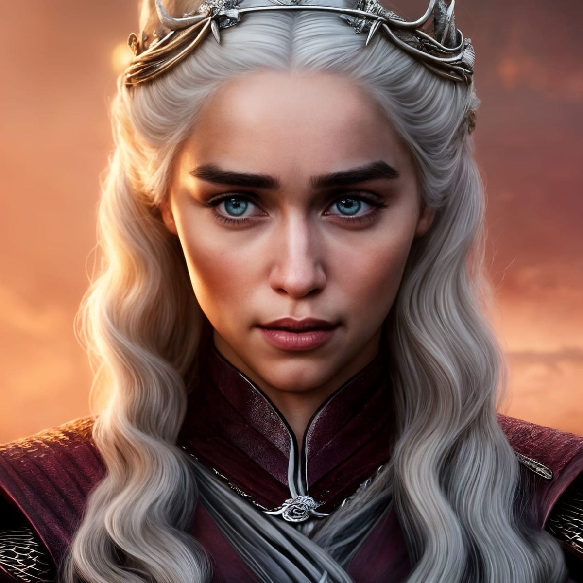 A digital painting of Daenerys Targaryen wearing a golden crown. The artwork showcases fantasy elements with dynamic lighting and intricate detail, reminiscent of concept art.