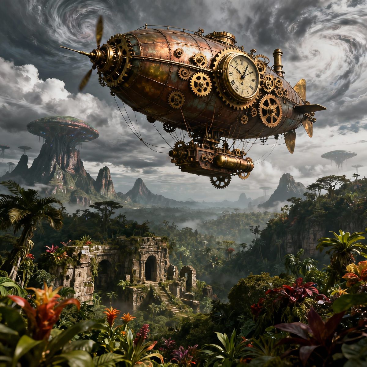 This image depicts a detailed steampunk airship navigating a sky with alien mountains and a vibrant jungle below. Photorealistic style with cinematic lighting.