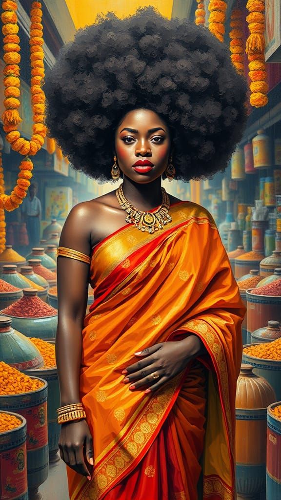 A striking picture of a confident woman in sari-inspired clothing standing in a Mumbai market. This impasto painting features layered brushwork and bold colors.