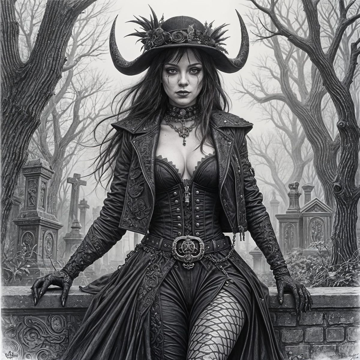 This image shows a stunning horrorpunk-inspired courtesan amidst a vibrant graffiti-covered graveyard, blending Victorian elegance with dark, gothic flair