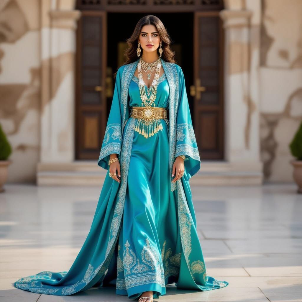 This image shows a Turkish woman from the Ottoman Empire. She wears an elegant turquoise silk dress with Ottoman designs and gold jewelry. The artwork evokes realism and opulence.