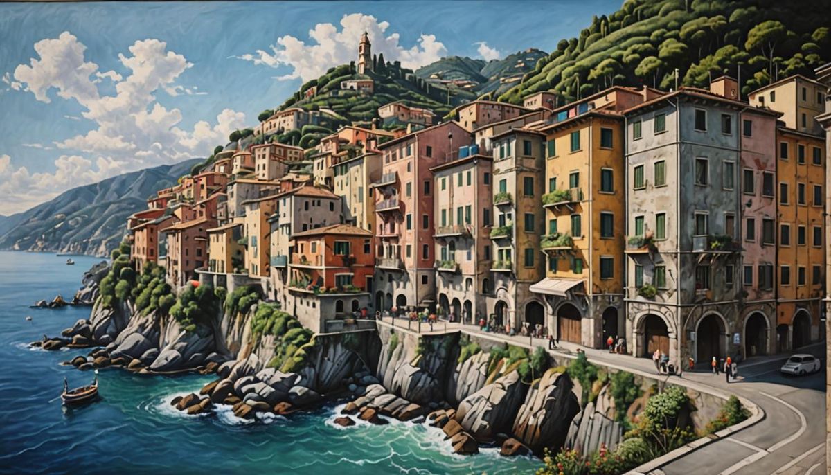 This image shows a chalk art style drawing of an Italian Riviera town, seemingly drawn on the side of an industrial building. The artwork is highly detailed and intricate.