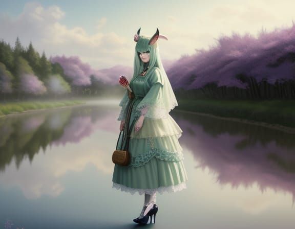 This image shows a plus-sized goblin sage in conservative clothing and a Rorschach mask, standing near a riparian fringe. The artwork is presented with soft pastel colors and golden lighting, in a kawaii fantasy style.