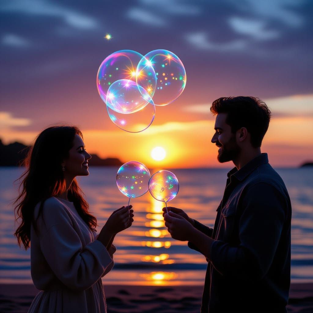 This image shows a silhouetted couple blowing bubbles as the sun sets. The scene is rendered in a cosmic style, reminiscent of astral holographic illustrations.