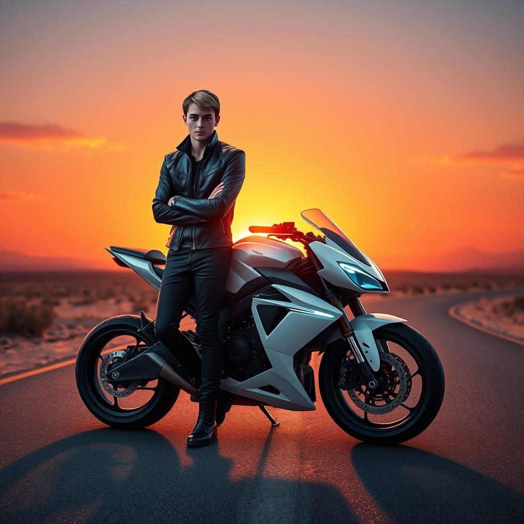 This image shows a stylish young man leaning on a futuristic motorcycle at sunset. The scene features a dramatic landscape with vibrant colors and detailed textures, rendered as high-end concept art in a matte-painted style.