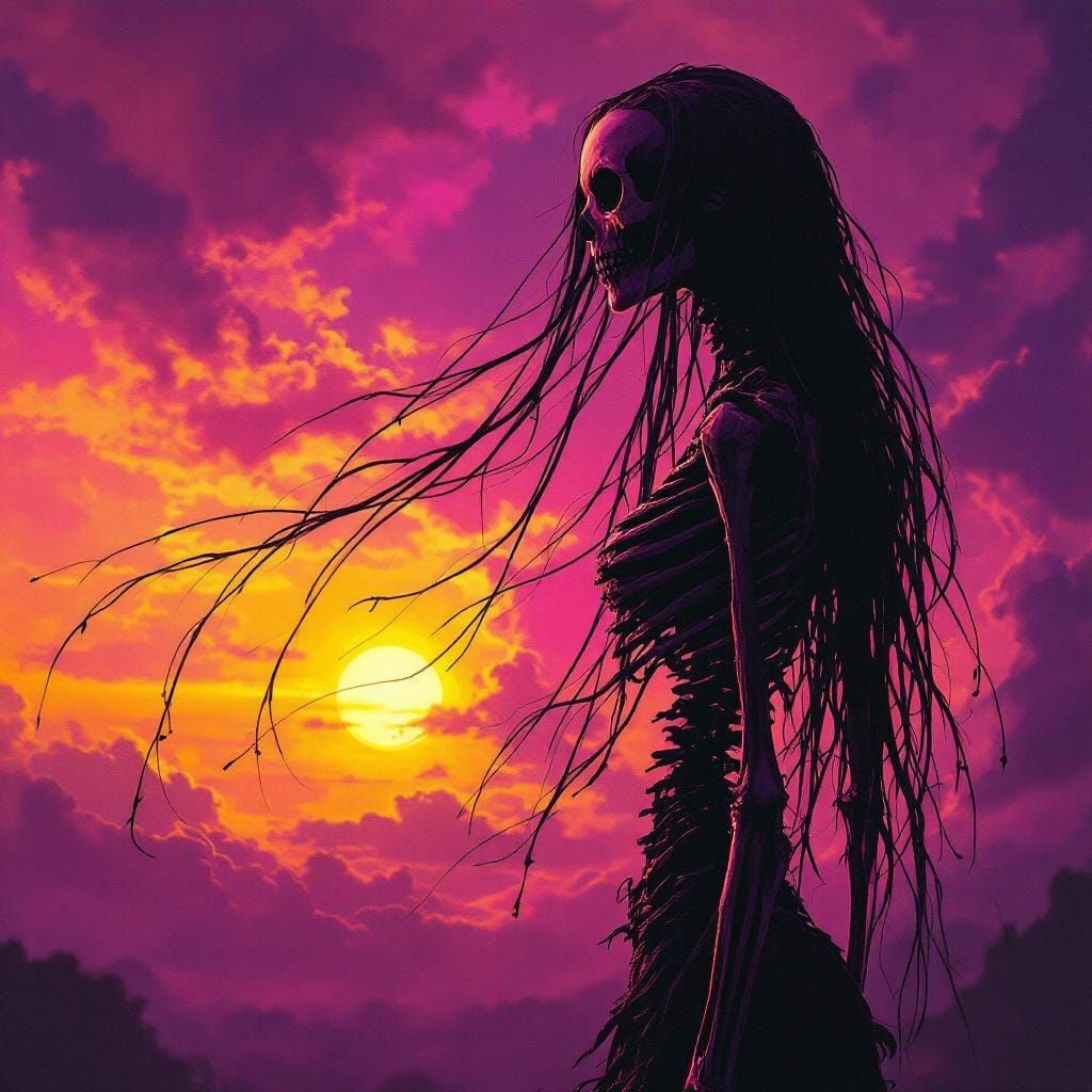 A striking picture of a slender voodoo doll woman silhouetted against a sunset. Dynamic lighting and intricate textures create a dark fantasy concept in rich purple and yellow hues.