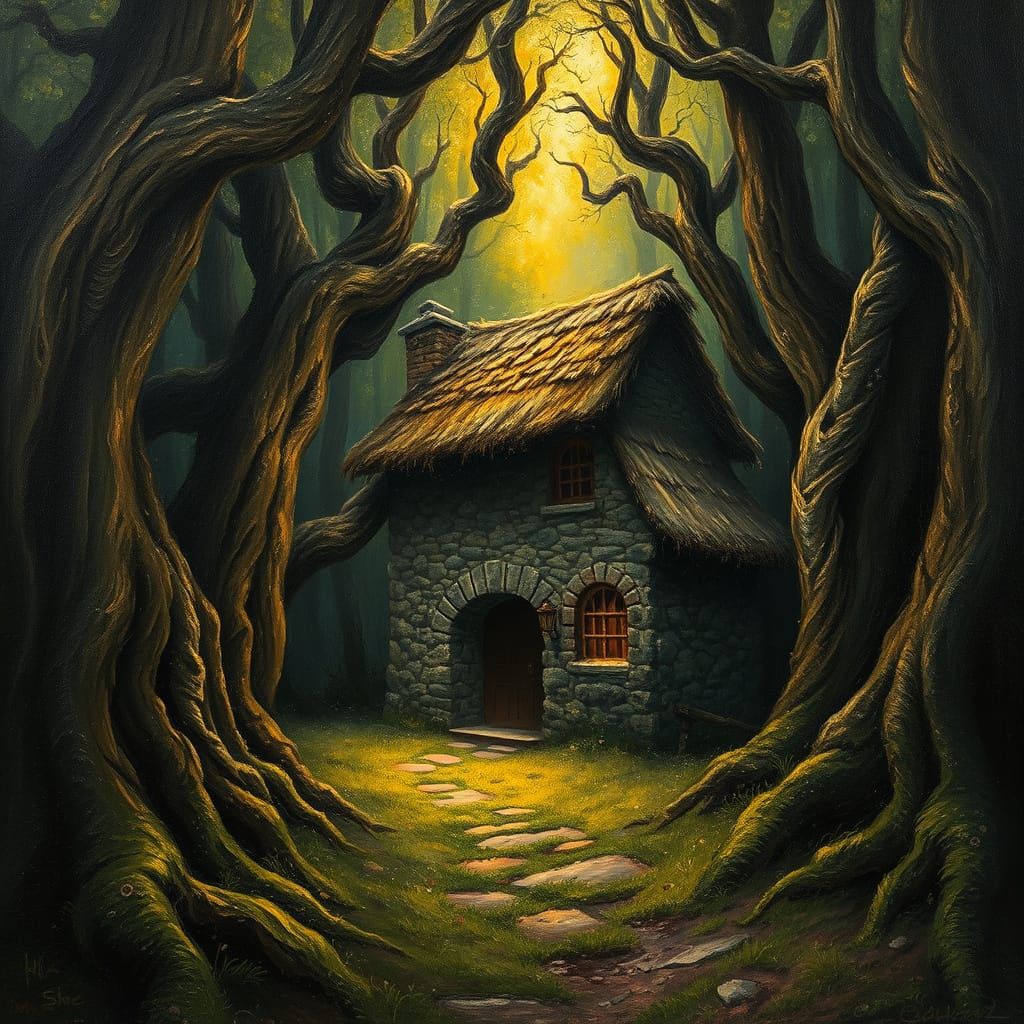 A striking picture of a storybook cottage hidden in a dark forest. Painted with thick oil strokes, the scene evokes a sense of mystery. Golden light pierces the canopy, highlighting the path.