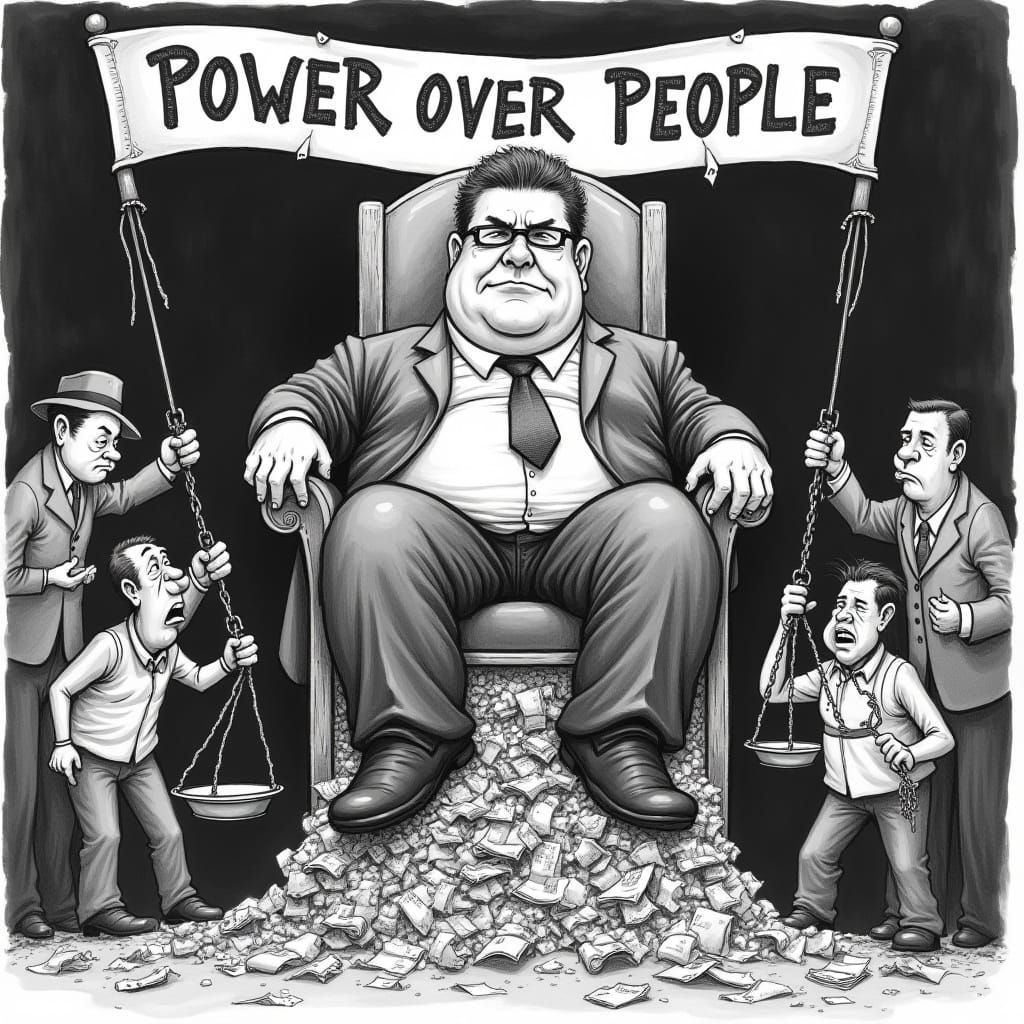A vintage editorial cartoon depicting a corrupt government official sitting on a throne made of crumpled cash and broken scales of justice, with ordinary citizens shackled to the pedestal, evoking a dark commentary on corruption and abuse of power in a society controlled by politicians.