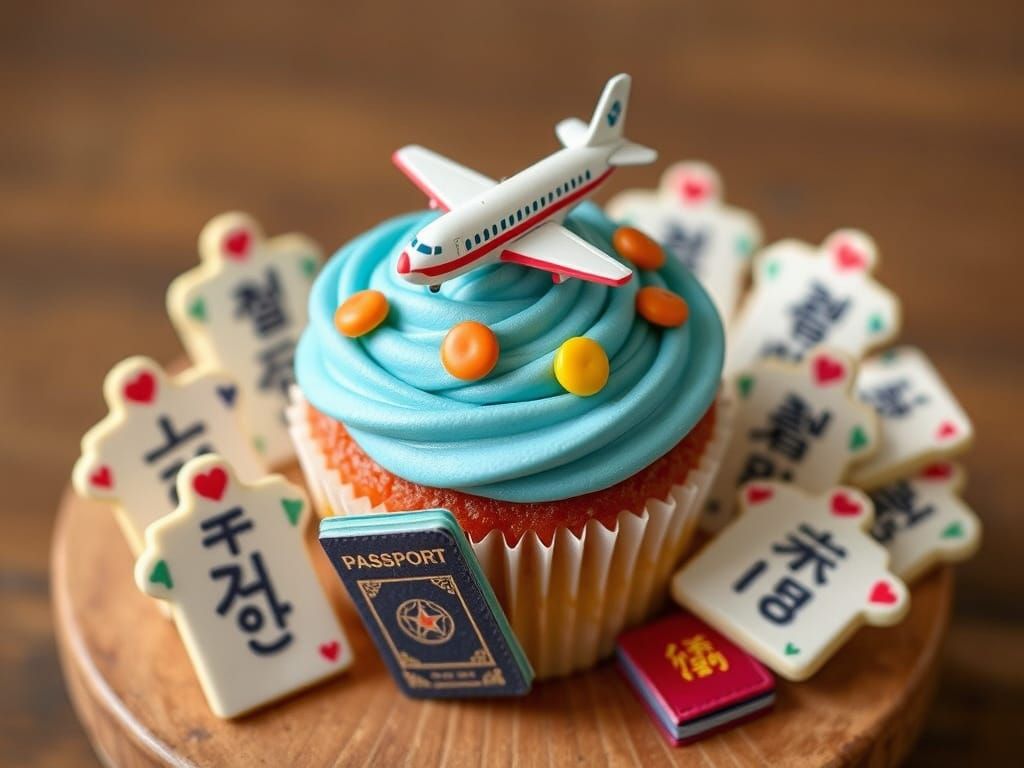 This vibrant image shows a whimsical birthday cupcake with a tiny airplane and Korean hanja characters, blending Japanese kawaii and Korean pop culture in a playful and dynamic style.