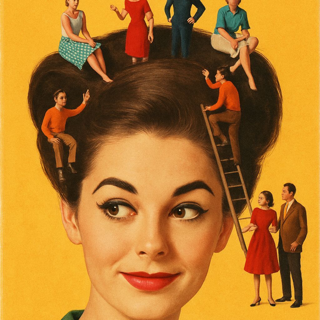This image shows a woman with a bun hairstyle, with tiny people standing on her head. The artwork has a vintage aesthetic reminiscent of 1960s advertising.