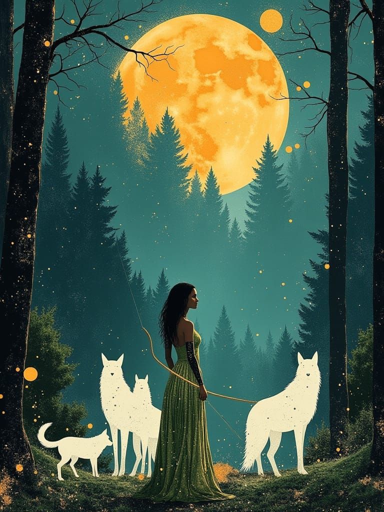 A striking picture of an African archer in chrome-green armor, drawing a golden bow, surrounded by six ethereal white wolves in a moonlit forest. Rendered as fantasy digital art.